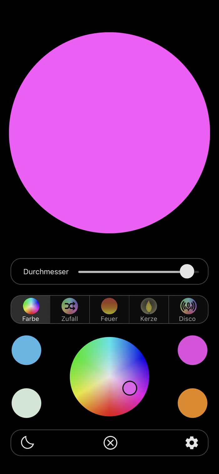Mit dieser App haben Sie eine schöne Beleuchtung immer und überall dabei. Verwandeln Sie Ihr Smartphone (iPhone) oder Tablet (iPad) in eine farbige Lampe.